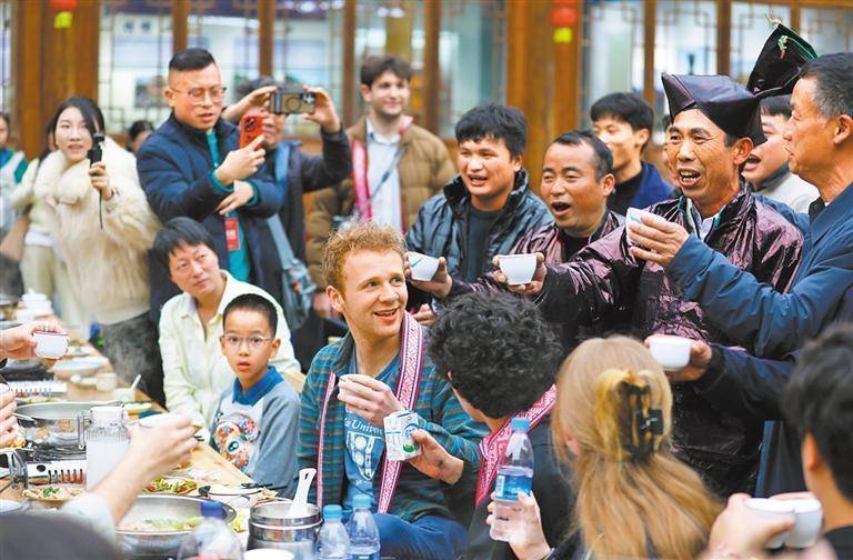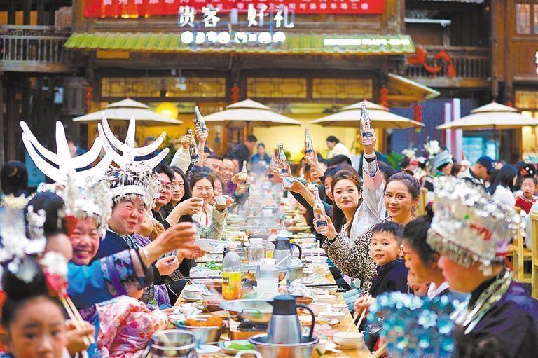 3月23日,游客在肇兴侗寨体验长桌宴,感受侗族文化的独特魅力。本报记者 吴秉泽摄