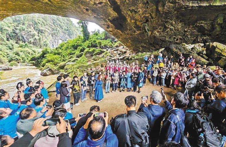 3月24日,肇兴天生桥景区,美国耶鲁大学威芬普夫斯阿卡贝拉合唱团与当地群众同台对歌。本报记者 王新伟摄