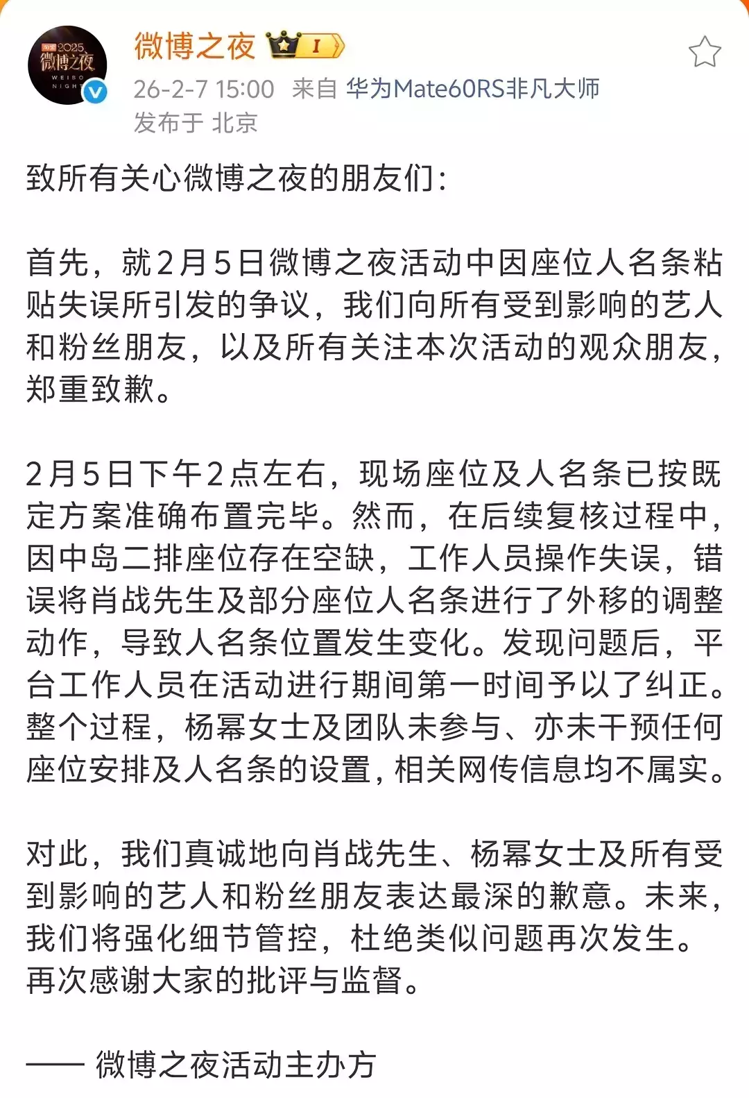 相比较之前较为模糊的致歉声明,微博之夜活动主办方最新声明清晰点出了两位明星的名字,正是肖战、杨幂,同时承认了座位争议给出席微博之夜的明星和粉丝都带来了影响。
